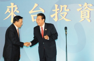 海協(xié)會和臺灣海基會昨天舉行陸資赴臺投資座談會,海基會董事長江丙坤(左)與海協(xié)會長陳云林(右)出席,向兩岸企業(yè)喊話招商。來源:臺灣《聯(lián)合報》