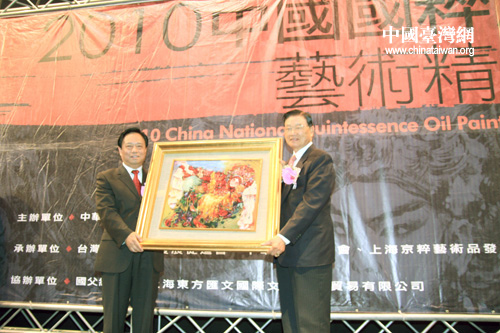 中國臺灣網1月30日臺北消息 2010中國國粹油畫藝術精品展30日上午在臺北市孫中山紀念館隆重開幕。中華全國臺灣同胞聯誼會會長梁國揚、海基會董事長江丙坤等兩岸知名人士,以及來自兩岸的數十位書畫藝術家,出席了開幕式。