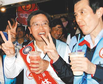 國民黨主席馬英九(右)陪國民黨籍“立委”補選候選人林德瑞(左)到新港夜市掃街,品嘗鹵味、木瓜牛奶等小吃,與基層搏感情。 來源:臺灣《聯合報》