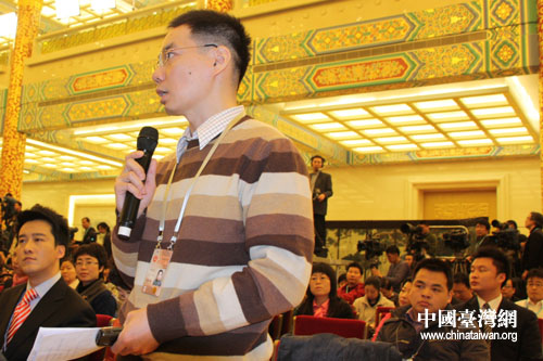 十一屆全國人大三次會議今日在人民大會堂舉行首場新聞發布會,圖為來自臺灣中天電視臺的記者向發言人提問。(中國臺灣網 徐維彬 攝)