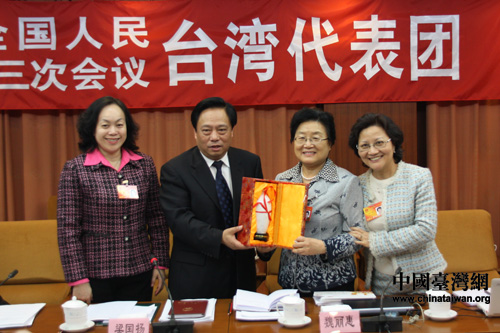 圖為全國人大代表、中華全國臺灣同胞聯誼會會長梁國揚向臺灣代表團臺籍女代表贈送節日禮物 (中國臺灣網 徐維彬 攝)