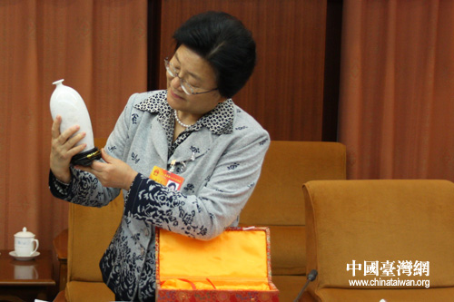 圖為臺籍女代表魏麗惠欣賞節日贈禮,她表示這是份精致的禮物十分珍貴、貼心。 (中國臺灣網 徐維彬 攝)