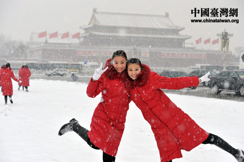 禮儀小姐興奮的映雪起舞。。ㄖ袊_灣網發 肖春陽、劉洋攝)