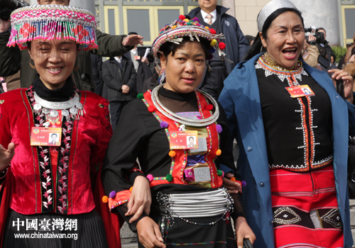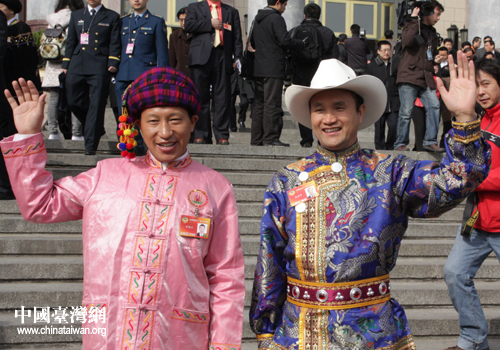 政協(xié)委員們今天盛裝出席閉幕會,少數(shù)民族委員穿上了民族服裝吸引鏡頭,宋祖英等解放軍界別委員一身戎裝分外精神,姜昆系上了紅領(lǐng)帶,女委員們也不約而同的身著紅衣,與天安門廣場上迎風(fēng)招展的國旗交相輝映,仿佛預(yù)示著2010年,中國——“紅”。(記者 張弛 高斯斯)