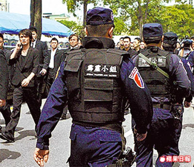 臺警方小組持槍在現場巡邏,并加強盤查青少年。 來源:臺灣《蘋果日報》