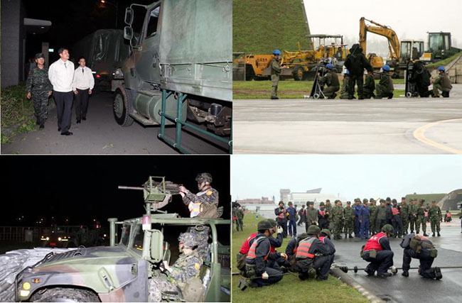 臺當局“國防部長”高華柱29日晚間視察戰術機動情況(左上)。臺空軍花蓮基地27日實兵演練(右上)。臺軍陸戰六六旅29日晚間演戲戰力保存戰術,往南機動執行“跨區增援”任務(左下)。臺空軍花蓮基地,27日臺軍參謀總長林鎮夷視察官兵操演實況(右下)。