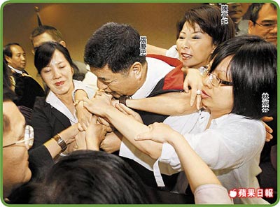中國臺灣網5月11日消息 據臺灣《蘋果日報》報道,臺灣“立法院”國民黨團昨強勢動員,在“立院內政委員會”初審通過攸關采認大陸學歷的“兩岸人民關系條例”修正草案,會議主席張慶忠要主持會議,遭民進黨民意代表林淑芬、陳亭妃強力阻撓,多名民意代表拉扯成一團(上圖)。民進黨民意代表邱議瑩更情緒激動,拿起主席臺上的法律參考書籍當場撕毀(下圖)。(中國臺灣網 高大林)