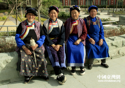 小金縣的藏族老奶奶們坐在和諧廣場內聊天。(中國臺灣網 高斯斯 攝)