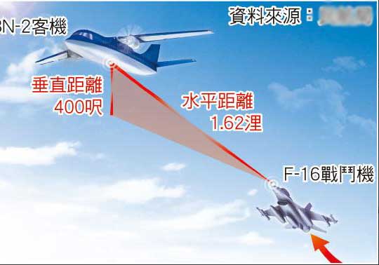臺軍一架F-16上月與臺灣大鵬航空小客機隔離不足,最近時垂直距離僅400呎、水平距離1.62浬(以戰機航速推估僅需30秒),有潛在碰撞風險。圖片來源:臺灣《蘋果日報》