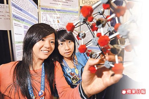 臺(tái)北女學(xué)生洪瑀(右)及林季潔(左)榮獲英特爾國(guó)際科學(xué)展大會(huì)化學(xué)科一等獎(jiǎng)。圖片來(lái)源:臺(tái)灣《蘋果日?qǐng)?bào)》