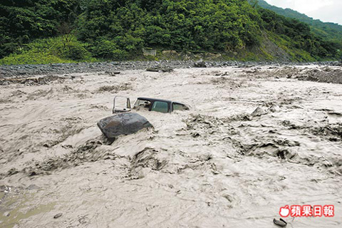 臺(tái)東嘉蘭村一輛吉普車原本要去幫忙拖陷在水中的車子,結(jié)果不慎反而被大水沖走,還好車上的人及時(shí)跳車,并無人員傷亡。圖片來源:臺(tái)灣《蘋果日?qǐng)?bào)》