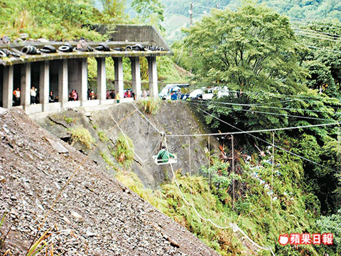 臺(tái)灣南投哈比蘭隧道坍方,六十多名游客及住戶受困,靠鋼索滑道脫困。圖片來源:臺(tái)灣《蘋果日?qǐng)?bào)》