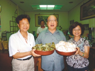 外埔鄉(xiāng)長(zhǎng)劉陳吻(左)昨天贈(zèng)送包子與粽子給臺(tái)中市長(zhǎng)胡志強(qiáng)(中),讓胡市長(zhǎng)非常高興。圖片來(lái)源:臺(tái)灣《聯(lián)合報(bào)》