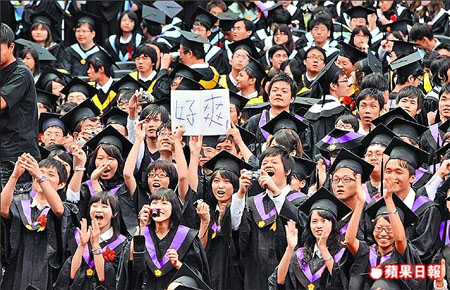 臺大舉行畢業典禮,畢業生高舉“好爽”的牌子表達愉悅心情。 來源:臺灣《蘋果日報》