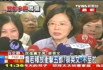 被問及如果明天(陳水扁)被釋放,是否會會沖擊選情。民進黨主席蔡英文說,“我覺得不至于啦,因為,經過這兩年來的沉淀,還有很多我們的思考,陳水扁的這個案子,現在大家思考都比較成熟,面對這個問題也都比較沉穩,我不認為這個問題在我們五都選戰里面,會有什么很大的沖擊。”