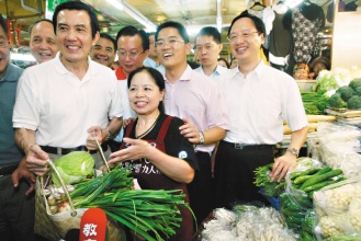 馬英九(前左)昨天探視陳樹菊(前右),向她買了兩萬元的菜。右一為臺當局“內政部長”江宜樺。圖片來源:臺灣《聯合報》