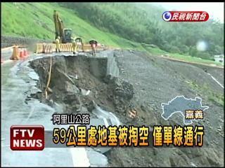 阿里山公路71公里處,因?yàn)椴粫r(shí)有落石坍方造成交通一度中斷,經(jīng)過緊急搶修加上實(shí)施管制后,才勉強(qiáng)通行。而阿里山公路59公里的路段,路基整個(gè)被掏空,路面和護(hù)欄都和崩塌的土石一起滾落,現(xiàn)場(chǎng)圍起封鎖線,只能勉強(qiáng)維持單線雙向通車。