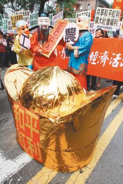 ECFA過關(guān),兩岸和平發(fā)展論壇的支持者以行動劇來表達(dá)“共享和平紅利,擴(kuò)大社會福利”的訴求。圖片來源:臺灣《聯(lián)合報(bào)》