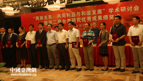 在會議首先進(jìn)行的第二屆臺灣研究優(yōu)秀成果頒獎(jiǎng)式上,全國臺灣研究會執(zhí)行副會長兼秘書長周志懷宣讀了評獎(jiǎng)結(jié)果。榮獲2008—2009年度臺灣研究優(yōu)秀論著獎(jiǎng)的為:一等獎(jiǎng)《冷戰(zhàn)后的日臺關(guān)系》(作者:吳寄南);二等獎(jiǎng)《臺灣文學(xué)與中華地域文化》(作者:朱雙一);三等獎(jiǎng)4部,分別為《海峽兩岸關(guān)系析論——以和平發(fā)展為主題之研究》(作者:李鵬),《臺灣工業(yè)化工程中的現(xiàn)代農(nóng)業(yè)發(fā)展》(作者:單玉麗、劉克輝),《“臺獨(dú)”的國際背景》(作者:周忠菲),《臺灣的中產(chǎn)階級》(作者:嚴(yán)泉、陸紅梅)。