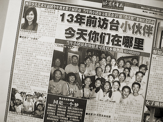 那是在2005年5月下旬的一天,辦公室有人在說,有個(gè)小天使在報(bào)上尋找當(dāng)年的小伙伴,名叫“莫尼卡”。我很驚詫這個(gè)名字很像蘇聯(lián)姑娘,更對這件事產(chǎn)生了興趣。迫不及待地找來了那份《北京青年報(bào)》,果然看到了那則特殊的“尋人啟事”,確切地說,那是記者的一份采訪報(bào)道,題目是《13年前訪臺(tái)的小伙伴,今天你們在哪里?》內(nèi)容正是第一屆大陸和平小天使孟妮卡在尋找當(dāng)年的小伙伴。那時(shí),我已經(jīng)離開了供職近20年的雜志社,調(diào)到新的部門工作,而恰巧的是,這個(gè)部門正在籌備迎接臺(tái)灣第十屆和平小天使的訪問。