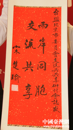 臺灣親民黨主席宋楚瑜為研討會親筆題寫賀詞“兩岸同胞 交流共享” (中國臺灣網 孫金誠 攝)