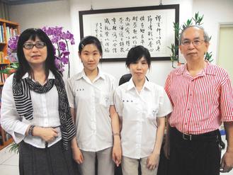 陳淑玲(右二)今年讀桃園縣振聲高中進修部二年級,三年級的女兒吳宜柔(左二)是媽媽的“學姐”,校長張湘君(左)勉勵她們用功讀書。 來源:臺灣《聯合報》