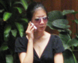 鄧曉倩15日到士林地方法院,開庭前在法院內頻頻講手機。圖片來源:臺灣《聯合報》