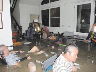 贍養院內坐輪椅的老人一度受困漂浮水中。 來源:臺灣《聯合報》