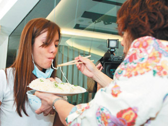 莎莎(左)22日返臺,母親趕緊送上豬腳面線壓驚。 來源:臺灣《聯合報》