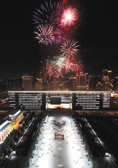 臺中市新市政中心昨晚舉行點(diǎn)燈儀式,新市政中心燈火通明與璀璨焰火互相輝映,照亮臺中市夜空。來源:臺灣《聯(lián)合報(bào)》