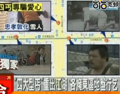中國臺灣網10月21日消息 據臺灣中天電視臺報道,一直被臺媒及臺灣網友熱炒的臺北東區“四大型丐”近日再現江湖,綽號為“雪人”、“搖頭”、“達摩”、“皇帝”的4名“乞丐”在臺北東區形成4大“丐王”的局面,他們各自擁有固守地盤,各有標志性的裝束及“病因”,假裝身有殘疾乞討。雖然4人已被列為警方特別管制對象,當仍然阻擋不了他們行乞,阻擋不了“皇帝”“乞丐”月收入近10萬(新臺幣,下同)的可觀收入。