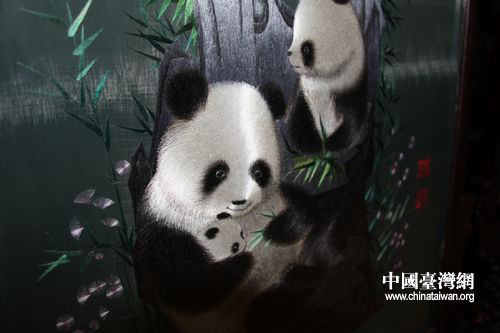 蜀江錦院中也陳列眾多蜀繡精品。圖為大小熊貓坐屏,繡工精美,纖毫畢現(xiàn)。(中國(guó)臺(tái)灣網(wǎng) 馬迪 攝)