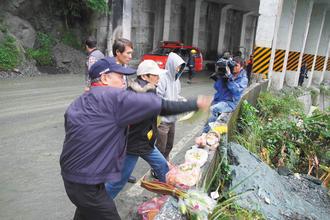 昨天正是事件發生后的“二七”,創意旅行團司機郭銘麟兒子郭翔、導游曾慶華等家屬帶著鮮花、冥紙,原本要到蘇花公路114.5公里處祭拜,但是搭乘的車輛行駛過112.8公里處,突然有落石掉落,相當危險,決定改在112.8公里祈福,難掩悲傷情緒。(中國臺灣網 王賽賽)
