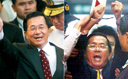 陳水扁曾在“臺灣之子”呼聲中,當(dāng)選并連任臺當(dāng)局領(lǐng)導(dǎo)人(左),但卸任不到半年,就因貪污疑云遭特偵組調(diào)查,并被申押禁見,陳水扁當(dāng)時高舉雙手,高喊政治迫害(右)。資料照片/杜建重、潘俊宏攝影 圖片來源:臺灣《聯(lián)合報》