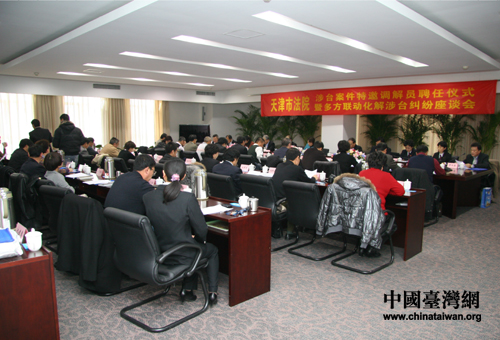 天津市高級人民法院舉行涉臺案件特邀調解員聘任儀式上,9名臺胞正式受聘上崗(圖片來源:天津市臺辦)