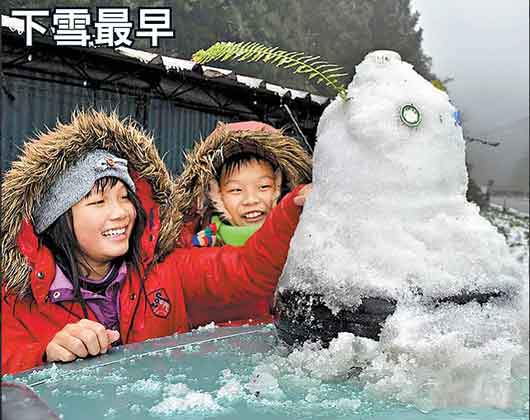 宜蘭縣與臺(tái)中縣交界的臺(tái)7甲線思源埡口附近昨清晨飄下全臺(tái)第一場(chǎng)瑞雪,孩童高興地堆起小雪人玩樂(lè)。圖片來(lái)自網(wǎng)絡(luò)