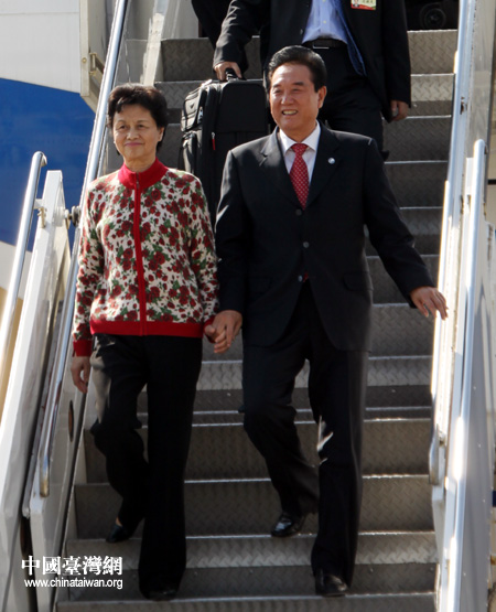 中國臺灣網12月20日臺北消息 20日中午,臺北桃園機場,海協會會長陳云林與夫人賴曉華攜手走下飛機。由陳云林率領的海協會協商代表團乘坐國航CA185次航班,于當天中午順利抵達臺北桃園機場,將參加于21日上午舉行的兩會領導人第六次會談。 (中國臺灣網 鐘寶華 攝)
