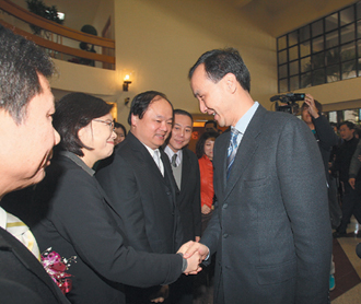 民進黨主席蔡英文(左二)上午出席新北市議會民進黨團干部交接,與新北市長朱立倫相遇。雙方都展現風度,三度握手。圖片來源:臺灣《聯合報》