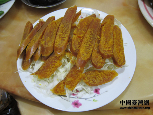燜烤烏魚子。色澤金黃,猶如黃金遍地;因其卵多,又有多子多孫多福氣之意。