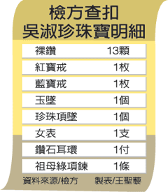 報道稱,臺特偵組于偵查中2度搜索扁家,將吳淑珍珍藏的大量珠寶扣案。這些珠寶琳瑯滿目,包括從扁家友人黃芳彥西裝口袋找到的裸鉆一共13顆、紅寶戒1只、藍寶鉆戒1只、玉墜1顆、珍珠項墜1條、女表1支、鉆石耳環1付、祖母綠項鏈1條,價格不詳。