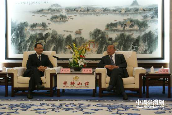 中共山東省委常委、濟南市委書記焉榮竹(右)在濟南舜耕山莊會見焦佑倫。(濟南臺辦肖明忠 攝)