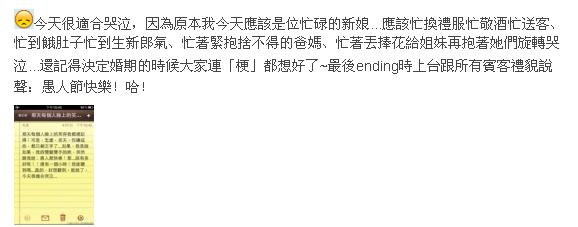 她傷心的表示,還記得決定婚期的時(shí)候大家連“梗”(搞笑)都想好了,最后ending時(shí)上臺(tái)跟所有賓客禮貌說(shuō)聲:愚人節(jié)快樂(lè)!哈!(中國(guó)臺(tái)灣網(wǎng) 馮存健)