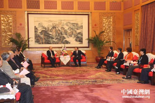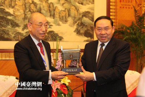 湖南省委副書(shū)記梅克保(左)4月2日在長(zhǎng)沙會(huì)見(jiàn)了以張京育(右)為理事長(zhǎng)的中華湖湘文化發(fā)展協(xié)會(huì)一行。(中國(guó)臺(tái)灣網(wǎng) 楊麗 攝)