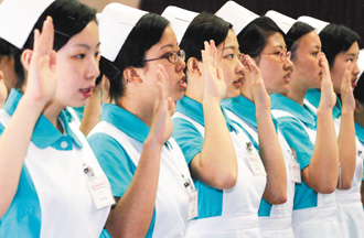 臺(tái)灣醫(yī)院護(hù)士荒,許多人拿到護(hù)士、護(hù)理師執(zhí)照后,卻不當(dāng)護(hù)士。圖為一所護(hù)校舉行加冠典禮,老師為所有小護(hù)生戴帽,并宣誓成為白衣天使。圖片來(lái)源:臺(tái)灣《聯(lián)合報(bào)》