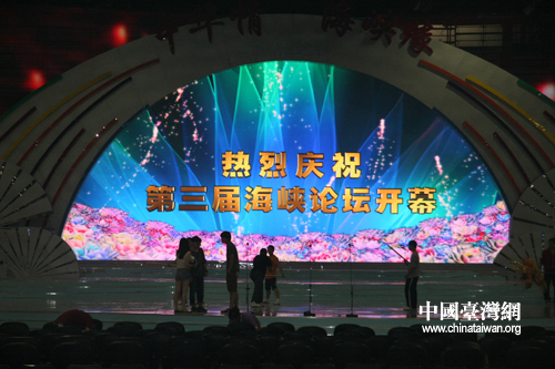 晚會舞臺上,幾個工作人員在進行最后的布置(中國臺灣網 普燕 攝)