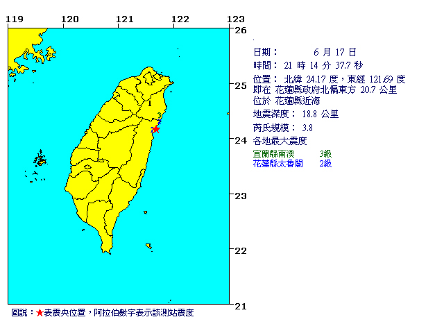 中國臺灣網(wǎng)6月17日消息 據(jù)臺灣氣象部門官網(wǎng)報道,17日21時14分,臺灣花蓮縣政府北偏東方20.7公里處發(fā)生里氏3.8級地震,地震深度為18.8公里。