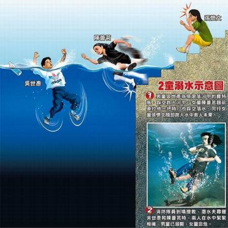 消防人員及警方趕到后火速下艇搜救,張懷文幫忙指認吳、陳落水位置。約半小時后,警方在距離兩人落水點5米處的河床找到這對小情侶,他們在水中緊緊抱著對方。兩人被救上岸時都已無生命跡象,送醫后,吳世彥經一小時急救宣告不治,陳薈茗恢復心跳,但生命征狀不穩定。(中國臺灣網 吳斌)