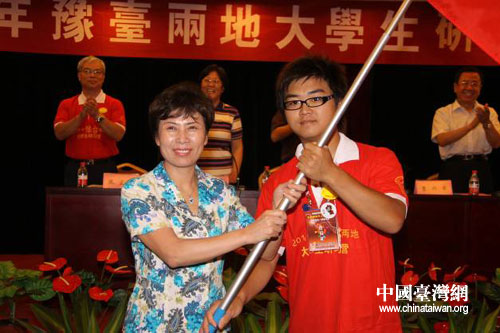 中國臺灣網7月15日鄭州消息 7月15日,由河南省臺辦、省臺聯主辦,以“走進天地之中、探尋‘四大古都’”為主題的2011年豫臺兩地大學生研習營在鄭州舉行開營儀式。河南省臺辦主任宋麗萍宣布“2011年豫臺兩地大學生研習營正式開營”并向營員授營旗。來自臺灣長榮大學、嘉義大學和華北水利水電學院的師生百余人參加開營儀式。
