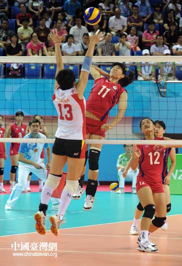 中國(guó)隊(duì)員13號(hào)陳伊娜網(wǎng)前攔截中華臺(tái)北隊(duì)11號(hào)球員吳淑芬的大力扣球。(中國(guó)臺(tái)灣網(wǎng) 董憲超 攝)