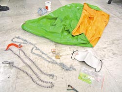 兇殘沒人性主嫌劉少祺以圖中帆布袋、口罩及膠帶等將被害人耳口蓋住,并將白膠灌進其耳朵中,甚至將狗鏈栓在被害人身上,以滿足自己的變態欲望。圖片來自臺灣媒體